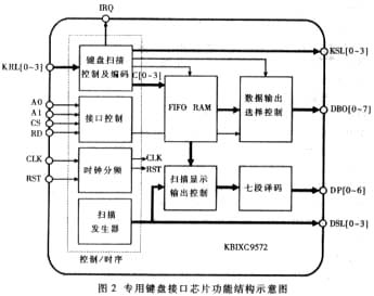 根据上述专用键盘芯片KB-CORE的功能要求,图2示出本芯片内部应有的结构框图。其工作原理如下:(1)键盘扫描控制及编码电路中内含一个环形计数器。该计数器计数输出至KSL [0~3]端作为键盘扫描信号。每当扫描信号发生变化时,键盘扫描控制器从KRL[0~3]端读入某一行按键的状态信号。如果没有按键被按下,则扫描下一行;如果有按键被按下,则控制器锁定被扫描行,并延迟约10ms去抖动,然后再次扫描被锁定行以确定按键是否误读。如果按键被证实按下,则一直等待直至用户松开该键。与此同时,数字键码将被保存到先进先出存储器,功能键则直接产生中断请求信号IRQ,通知CPU读取键码DBO[0~7]。(2)FIFO RAM中数据容量为16位。每4位对应一个字形符,所以七段LED数码管需要4位。(3)扫描发生器一方面产生LED的位选信号DSL[0~3],另一方面产生扫描显示输出控制电路的位数据选通信号。扫描显示输出控制电路根据位数据选通信号读取FIFO RAM中相对应的数据,然后送七段译码电路输出DP[0~6]驱动LED显示屏的段选信号电极。(4)接口控制电路一方面用来识别CPU的读时序;另一方面用来对地址信号线A1A0译码,实现对输出数据的选择。若A0A1="00",则输出FIFO RAM中的低字节数据;若A0A1="01",则输出FIFO RAM中的高字节数据;若A0A1="10",则输出控制数据(表明ROW、COL、DAT中哪一个被按下);若A0A1="11",则不输出FIFO RAM中的任何数据。