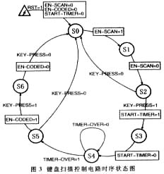 键盘扫描时序的基本原理可以用图3所示的状态图表示。状态图的输入变量为RST(复位)、KEY-PRESS(有按键)、TIMER-OVER(去抖动延时结束);输出变量包括EN-SCAN(扫描行转移)、EN-CODED(键盘编码启动)、START-TIMER(开启去抖动延时)。从图3中知道,状态S0→S1→S2为按键扫描状态链,状态S3→S4→S5为去抖延时状态链,状态S6为按键保持期。当按键被按下时,进入启动(S3)去抖延时状态链;去抖延时结束后(S5),若按键没有按下则恢复扫描状态链(S0);若按键确认被按下则进入保持期(S6),并输出按键编码维持至按键松开。